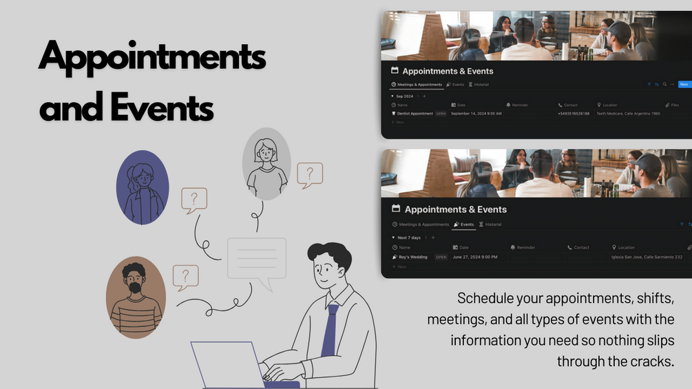The Events Calendar is designed to keep track of special moments. From birthdays and anniversaries to family or social gatherings, this space lets you schedule and enrich the event details with additional information like location, contacts, and relevant notes.